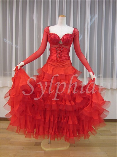 Sold Out★値下げ☆【掲載依頼・試着可】未使用・新品同様・ラテンドレス【L-132・朱赤・フリル】