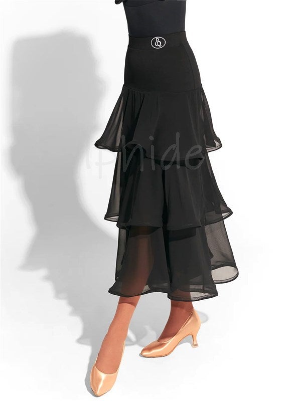3段のティアードのスカート。若干の透け感あるジョーゼット軽やかで可憐なデザインですが、可愛くなりすぎないボリューム感が絶妙!エレガントで特別感のあるスカート。黒なのでトップスが合わせやすくお洒落なパーティードレスとしてもご活用いただけます。