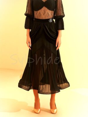 太もも部分からのジョーゼット生地が透けるので、かわいらしいラインの中にクールで攻めた感があり絶妙な甘辛バランスの素敵なスカートです!