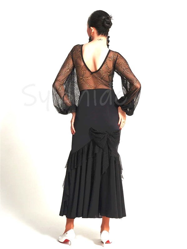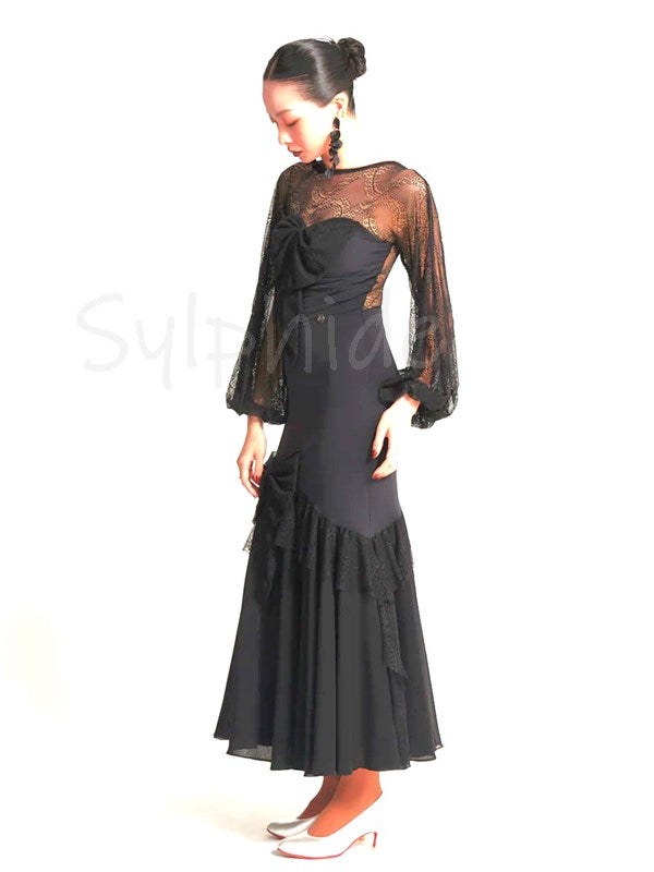スカートはジョーゼット2枚仕立て。ボディーから繋がる伸縮性ある生地とジョーゼットの切り替えラインがサイドは低く、前後は高い位置(レースが付いているのが切り替えライン)になっており、マーメイドのセクシーさと綺麗に広がる華やかさを兼ね備えています。軽やかですが透け感はありません。