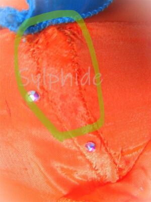 | 状態 | ダメージありますが、遠目に目立つほどではありません。 1.スカートの縫い目のほつれ・3㎝未満(修繕しているところともあります。) 2.内側のインナーのネット生地に穴 3.目立たない程度で多少の石落ち 4.袖は無かったものに、後から袖を付けたようです。 |