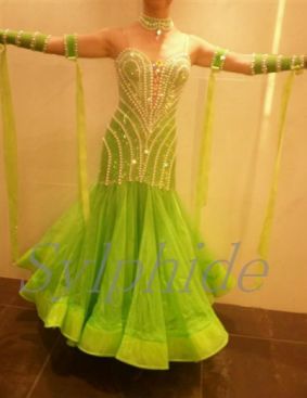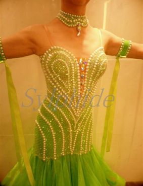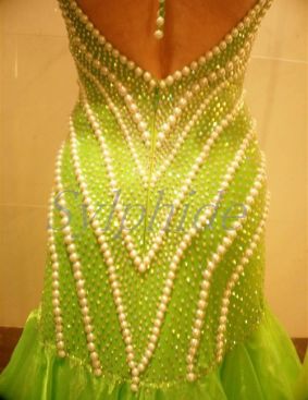 今回ご案内するドレスも、とても美しいアップルグリーンはフロアーに映え、豪華で個性的なデコレーションで印象的です。