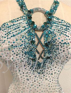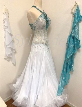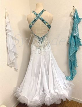 ヨーロッパ選手のドレスで、白に水色を合わせた、清々しく、大変品の良いドレスです。