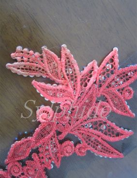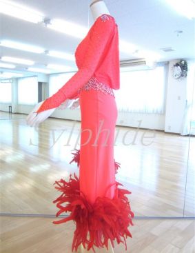 スカート裾には、赤のコック羽があしらわれ、ゴージャス。