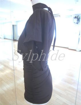 スタンドネックで、首の後ろで結ぶリボンがポイント。