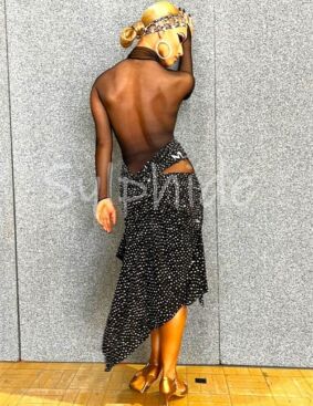 個性的なカットと、黒に眩いストーンが、意志の強さを表すようで、フロアーを支配できそうな魅力的なドレスです。