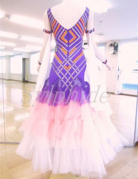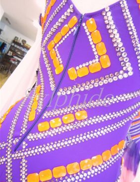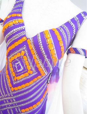 赤みのある花紫色のボディーに、蛍光のオレンジの大型ストーンで個性的にデコレーションした、インパクトのあるドレス。